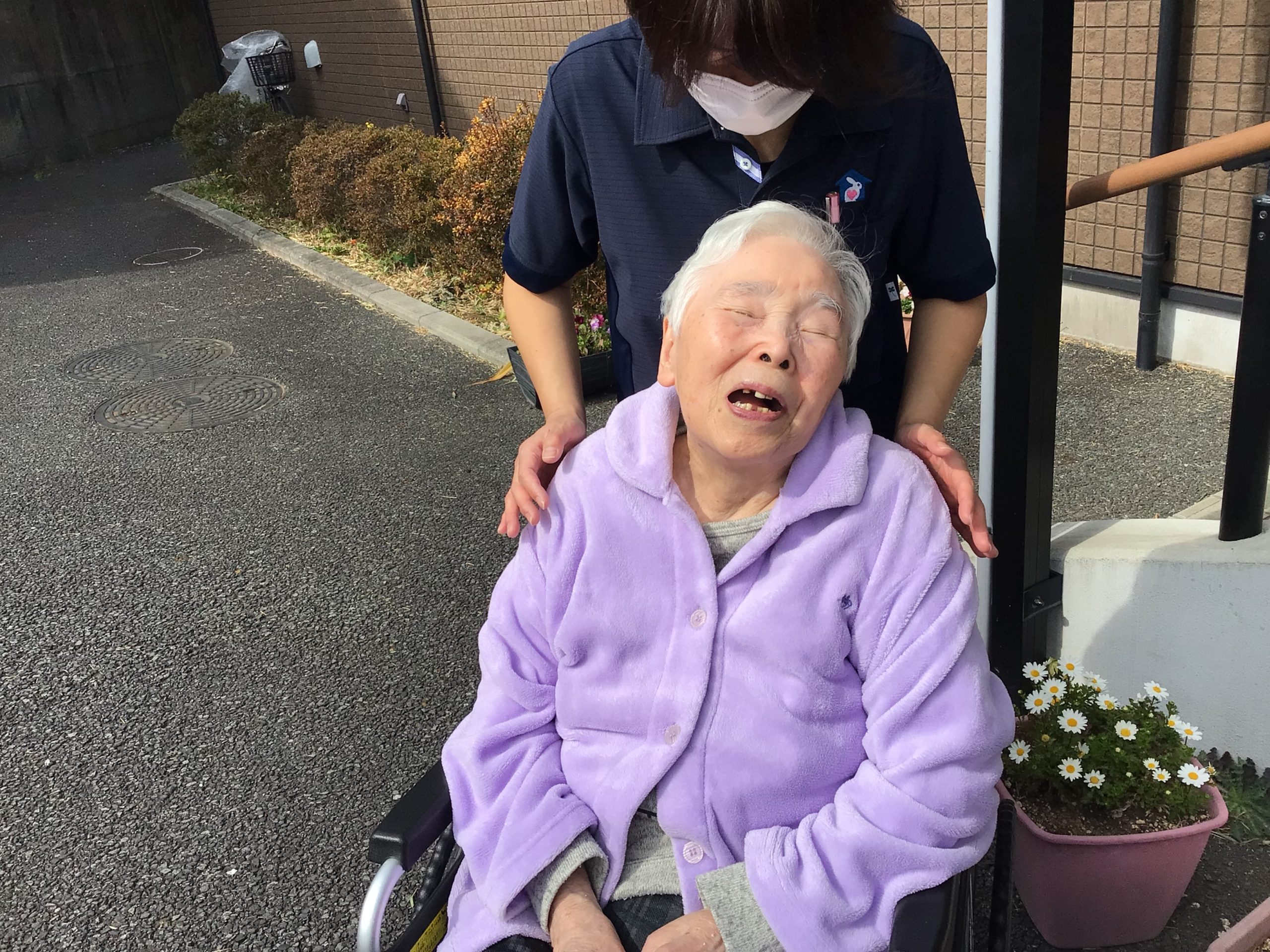 3月2日【天気:晴れ】 風がなく、とても暖かかったので午前は2階の入居者様全員で玄関先に出て外気浴をしました。