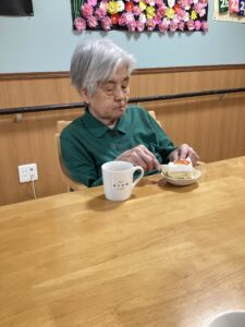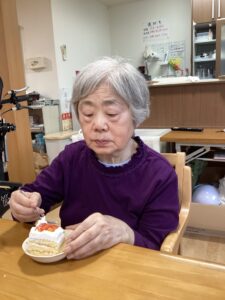 ケーキの盛り付けをしながら会話を弾ませ、みんなでバースデーソングを歌いました。